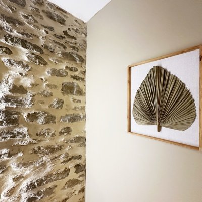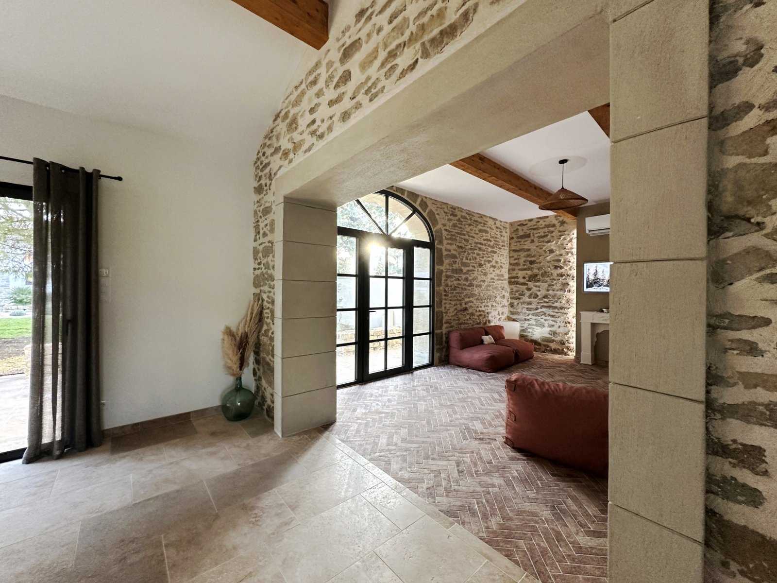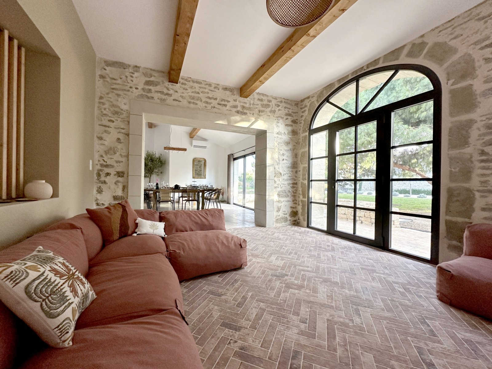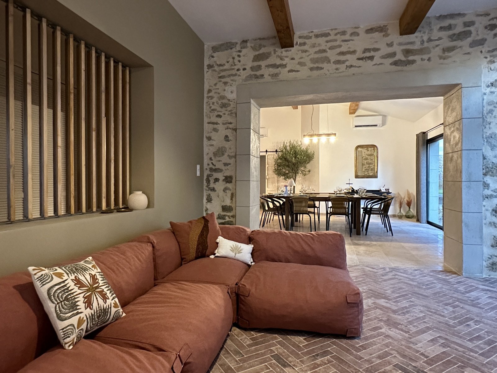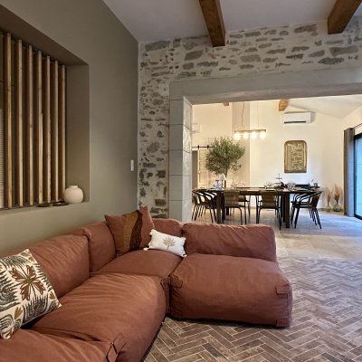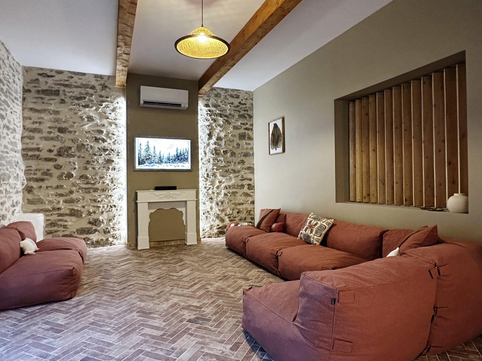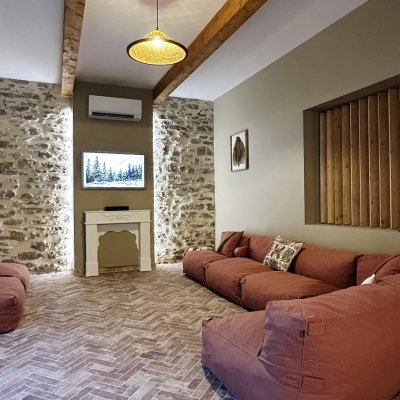Le salon du domaine est un cocon cosy, idéal pour se détendre à tout moment de la journée. Baigné de lumière grâce à sa jolie verrière, il mêle ambiance intimiste et esprit convivial. Sur le mur, la télévision Samsung Frame se fond dans le décor comme une véritable œuvre d’art, apportant une touche élégante et discrète à l’espace.