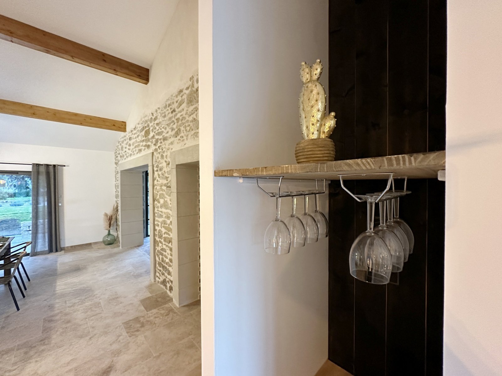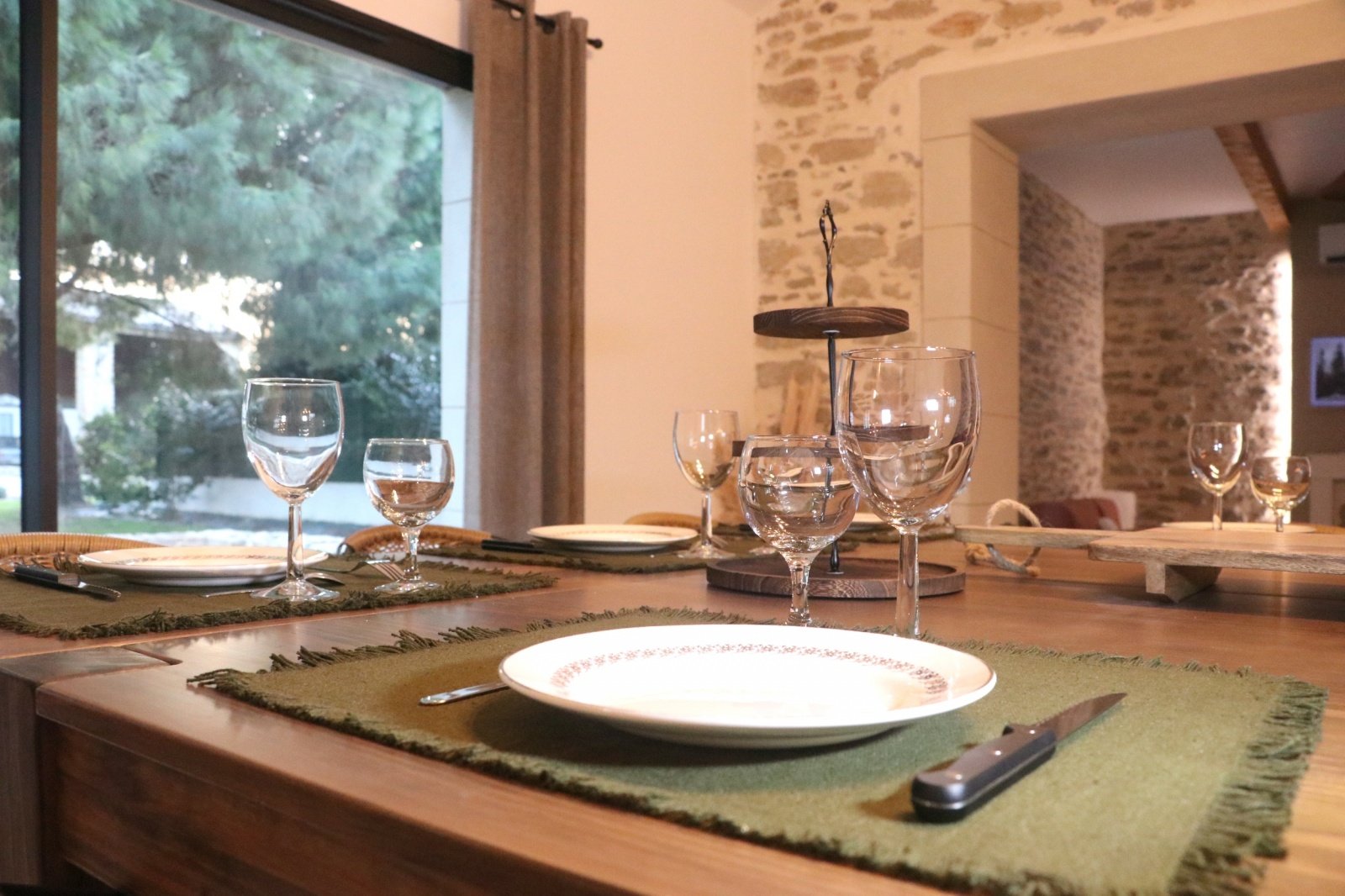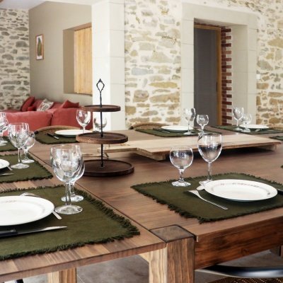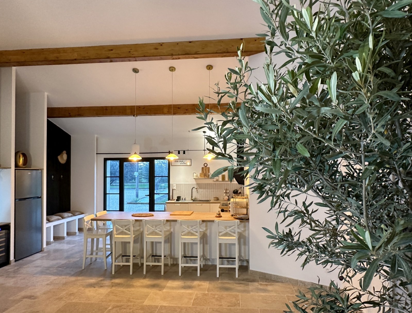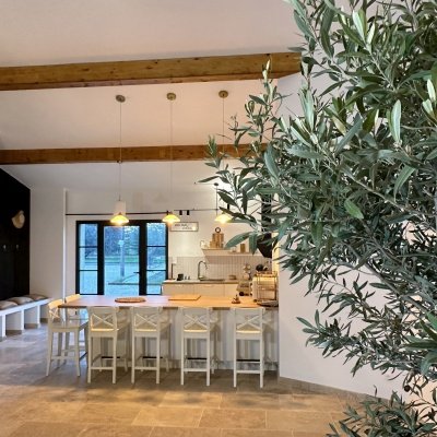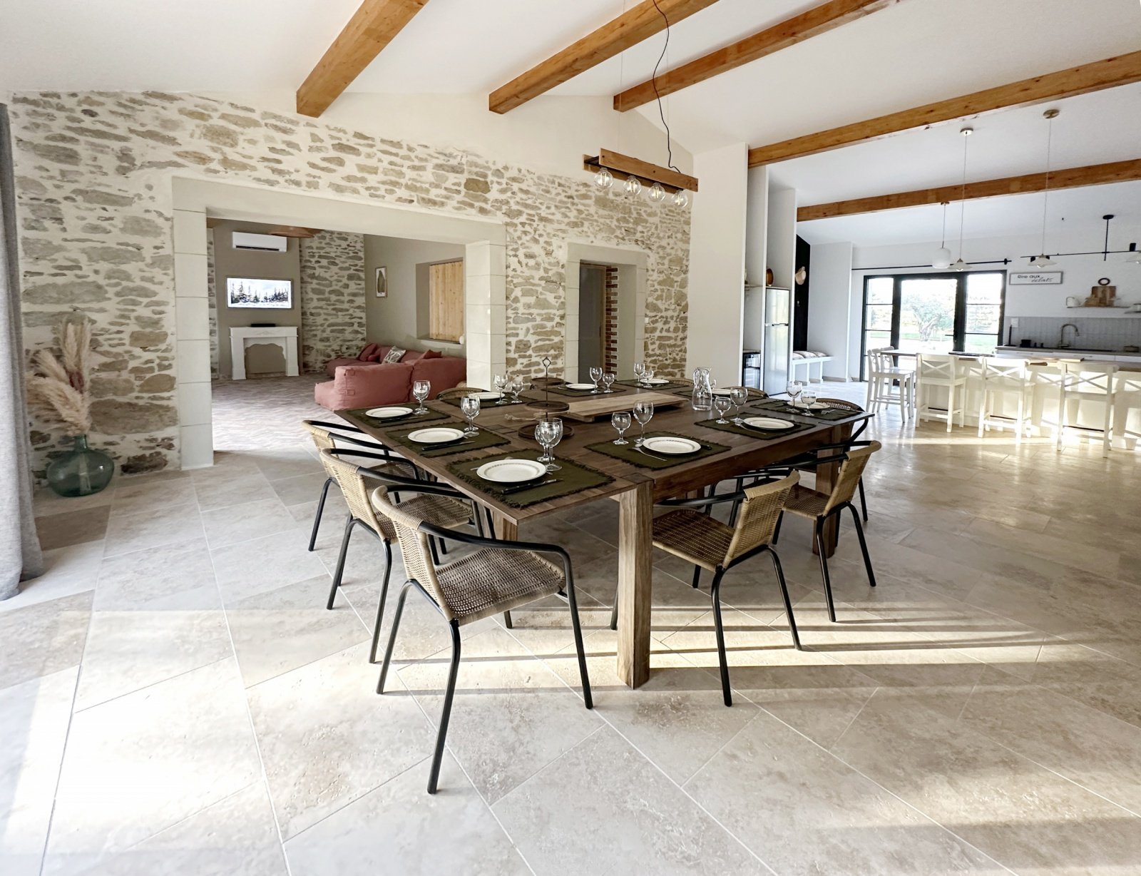 Au cœur du domaine, la grande salle à manger avec cuisine ouverte est un véritable lieu de partage. Conviviale et lumineuse, elle offre une vue panoramique sur les extérieurs, créant un lien constant avec la nature environnante.